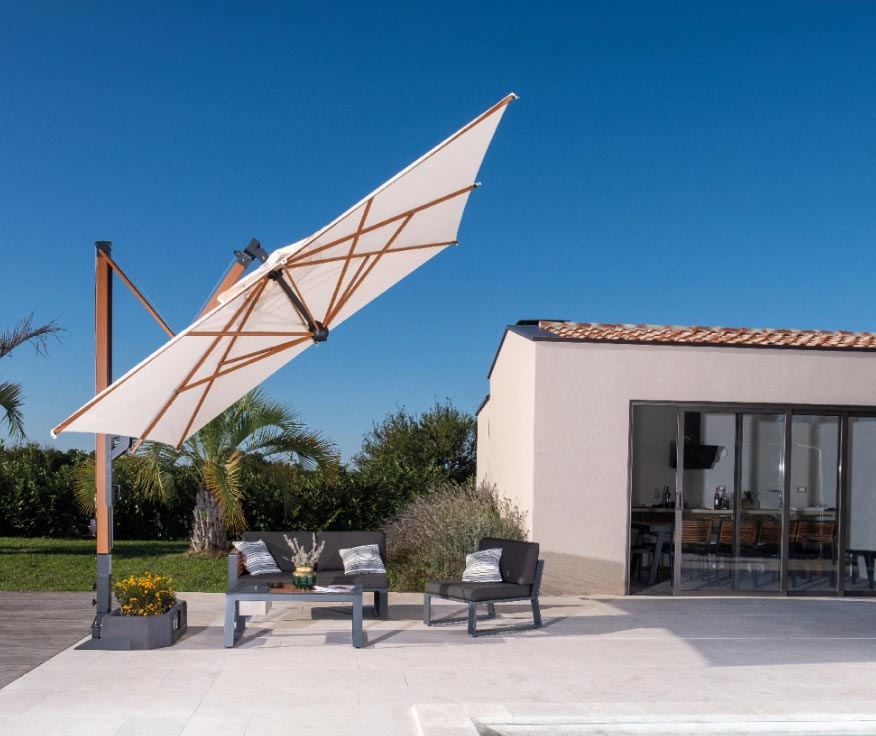 Scolaro parasols are waterproof and UV-resistant. Regular cleaning and the use of a protective cover significantly extend their lifespan.