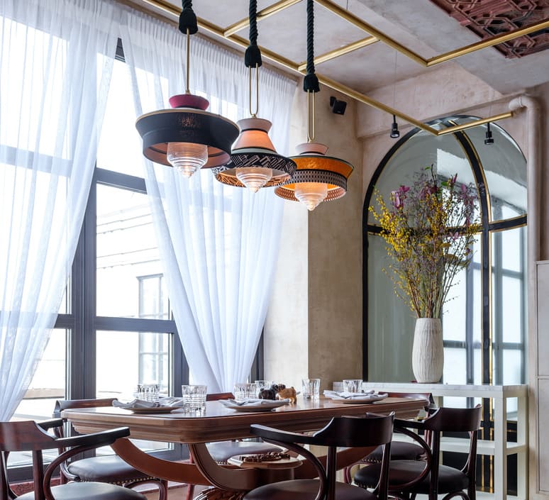 Die Hängeleuchte Calypso Guadaloupe von Contardi verkörpert die tropische Eleganz und das Flair der 1940er Jahre. Entworfen vom Designstudio Servomuto, kombiniert sie geometrische Muster mit lebhaften Farben, inspiriert von südamerikanischer und tropischer Kultur.