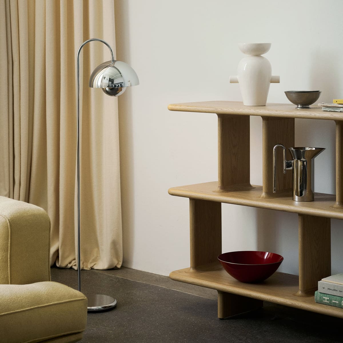 Die Flowerpot Stehleuchte VP12 von &Tradition, ein Meisterwerk des legendären Designers Verner Panton aus den 1960er Jahren, verkörpert die perfekte Verbindung zwischen Retro-Charme und zeitgenössischer Eleganz. Als charakteristischer Vertreter der Flower-Power-Ära interpretiert diese Leuchte den verspielten Geist jener Zeit in einer modernen Form neu. Der renommierte Hersteller &Tradition setzt bei der Fertigung auf hochwertige Materialien wie lackierten und verchromten Stahl, die die ursprüngliche Vision Pantons in höchster Qualität zum Leben erwecken.