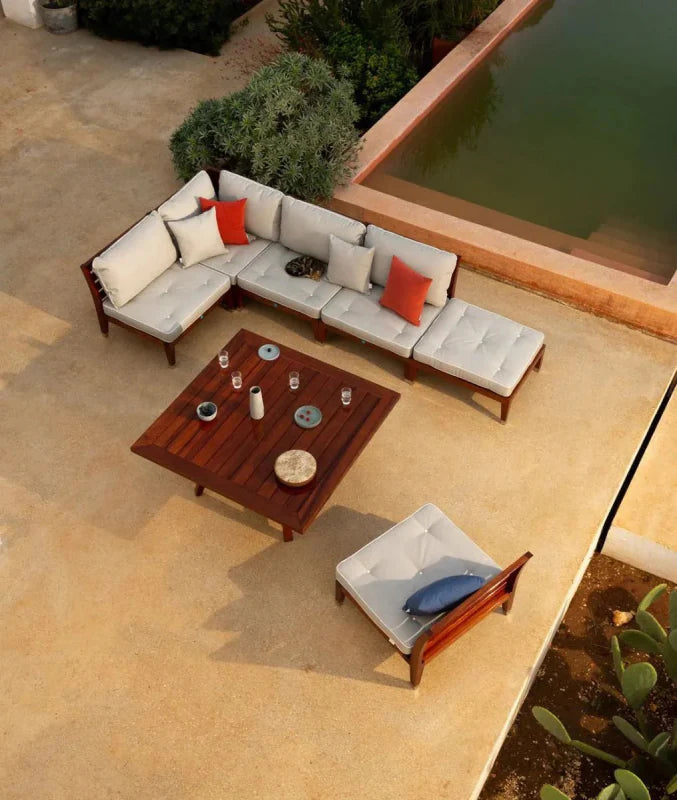 The collection "C'est la vie" by Unopiù is inspired by the joy of life and combines classic, elegant style with high-quality materials. The middle sofa made of polished mahogany recalls the elegance of English furniture and the surfaces of antique ships, perfect for luxurious pools, spas, or exclusive homes.