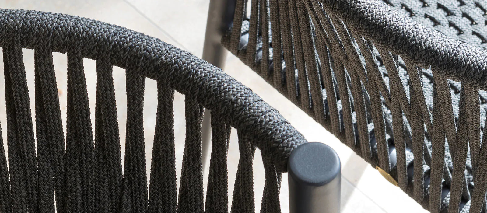 The Luce Sofa by Unopiù combines elegant design with high comfort: A robust aluminum structure in graphite gray, wrapped in hand-woven polyolefin rope, unites sophistication and structural elegance.